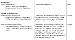 An example of this could be the scaffolding of creative writing in my poetry unit, where we began with simpler and easier writing techniques before transitioning into more complex creative writing techniques that were based on the skills learnt before. Another example is in my Lord of the Flies unit where we began exploring each chapter with teacher-led discussions that followed planned discussion points that I had to introduce. Throughout the unit we continuously focused on these chapter discussions and transitioned from teacher-led to student-led discussions where the students were comfortable exploring the chapter through their own understanding.